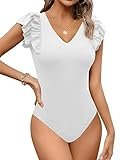- 💖【Mezcla de ideas de moda】- Top con lazo de corte escalonado, mangas con volantes, body de punto acanalado para mujer, tops con cuello en V, body básico informal para mujer, colores lisos de moda, cierre de botones en la entrepierna. El cuello en V alarga tu cuello, mientras que las mangas ligeras añaden un toque femenino a tu look.