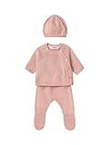 - Características: Conjunto de 3 piezas para recién nacida niña, con estampado de flores, en punto acanalado, body de mangas largas con volantes, pantalón con cintura elástica, y diadema con lazo de mariposa