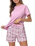 Litherday Pijama Mujer Verano Algodón Manga Corta Conjunto de Pijamas Cómodo y Transpirable con Cuello Redondo y Pantalones Cortos Ropa para Dormir con Bolsillos y Cordón, Rosa, S